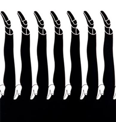 在1975年为日本京王百货设计的宣传海报中,福田就开始利用"图"、"底"间的互生互存的关系来探究错视原理。作品巧妙利用黑白、正负形成男女的腿,上下重复并置,黑色"底"上白色的女性的腿与白色"底"上黑色男性的腿,虚实互补,互生互存,创造出简洁而有趣的效果,其手法为"正倒位图底反转"。